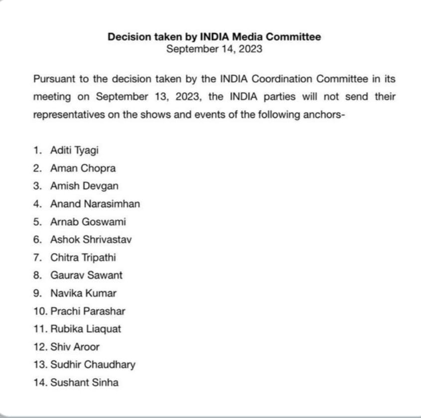 ಐ.ಎನ್.ಡಿ.ಎ.ಐ. ಸಮನ್ವಯ ಸಮಿತಿಯು ಸೆಪ್ಟೆಂಬರ್ 13, 2023 ರಂದು ತನ್ನ ಸಭೆಯಲ್ಲಿ ತೆಗೆದುಕೊಂಡ ನಿರ್ಧಾರದ ಪ್ರಕಾರ, ಐ.ಎನ್.ಡಿ.ಎ.ಐ. ಪಕ್ಷಗಳು ಈ ಕೆಳಗಿನ ಆಂಕರ್ಗಳ ಕಾರ್ಯಕ್ರಮಗಳು ಮತ್ತು ಕಾರ್ಯಕ್ರಮಗಳಿಗೆ ತಮ್ಮ ಪ್ರತಿನಿಧಿಗಳನ್ನು ಕಳುಹಿಸುವುದಿಲ್ಲ ಎಂದು ವಿರೋಧ ಪಕ್ಷದ ಮಾಧ್ಯಮ ಸಮಿತಿಯ ಹೇಳಿಕೆ ತಿಳಿಸಿದೆ.